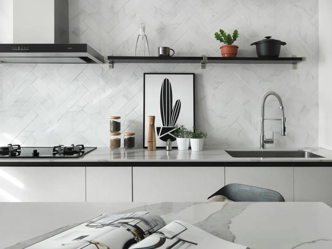 ▲厨房墙面的隔板架上的绿植与瓶瓶罐罐摆设,也让厨房显得更加文艺精致。